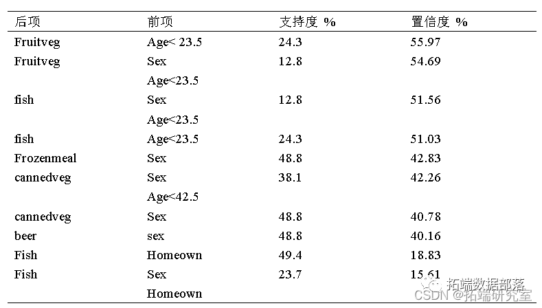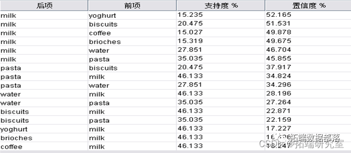 Rule10: water→milk,supprot =46.133%,confidence =28.196%;