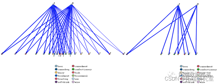 然后,本文对不同性别、年龄的顾客购买的商品之间的销售关系进行了Apriori模型的关联规则挖掘。实验结果如表所示,其中性别与购买商品的联系如图所示,(a)为不同性别顾客可能同时购买的所有商品之间的联系,其中网状图上方的两个点F、M分别代表着男性顾客与女性顾客,网状图下方的点分别代表不同的商品,点与点之间的连线代表着购买关系。通过设定商品同时出售的频数的阈值,可以得到不同性别的顾客同时购买的概率比较大的商品(b)。由图可知,男性最有可能同时购买饮料、牛奶、罐头蔬菜、甜食、冷冻熟食、果熟等商品,而女性则最有可能同时购买饮料、甜食、牛奶、罐头蔬菜等,因此,商家在推销其商品时可以针对不同性别的顾客制定不同的营销策略。