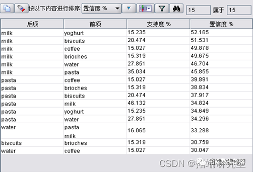 通过格式转换,发现数据源中共有二十种商品,设最低条件支持度为15%,最小规则置信度为30%,最大前项数为5,选择专家模式,挖掘出大类商品的15条关联规则,如图所示。生成的15条规则如下所示: