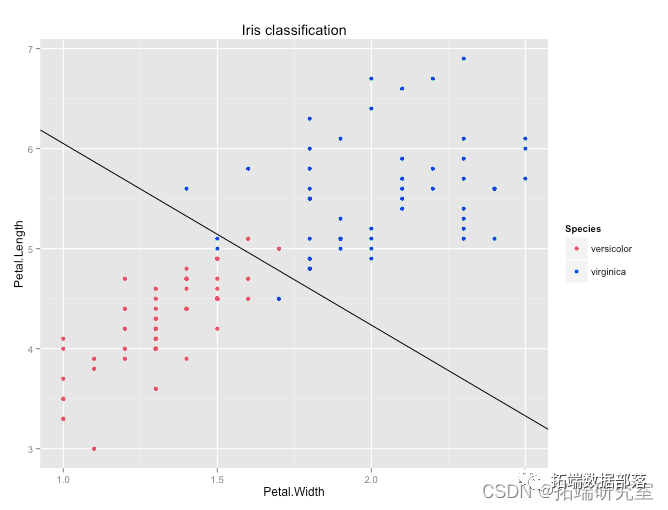 # 从模型中获得预测结果logit.predictions <- ifelse(predict(logit.fit) > 0,'virginica', 'versicolor')