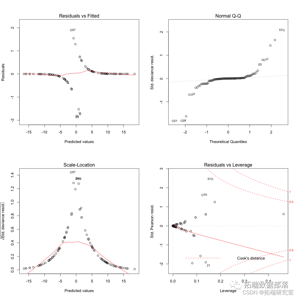 在所有可能有问题的观察中,我们注意到第 57 个观察样本可能是异常点。检查诊断图,我们看到逻辑回归的趋势特征,包括残差与预测图中的两条不同曲线。第 57 个观察样本出现在每个诊断图中,但幸运的是没有超过库克的距离。