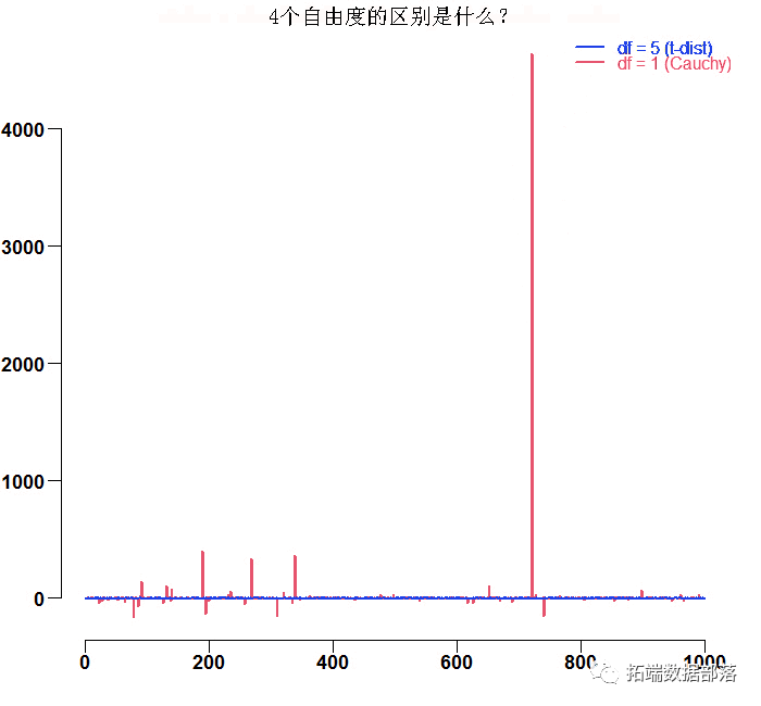 黑线是近似正态的。红线代表Cauchy分布,它是具有一个自由度的T分布的一个特殊情况。也许是因为Cauchy和t分布混在一起。我们总是可以计算出经验方差。请看下图。这是对1自由度的t分布(红色的Cauchy分布)和5自由度的t分布(蓝色)的模拟结果。