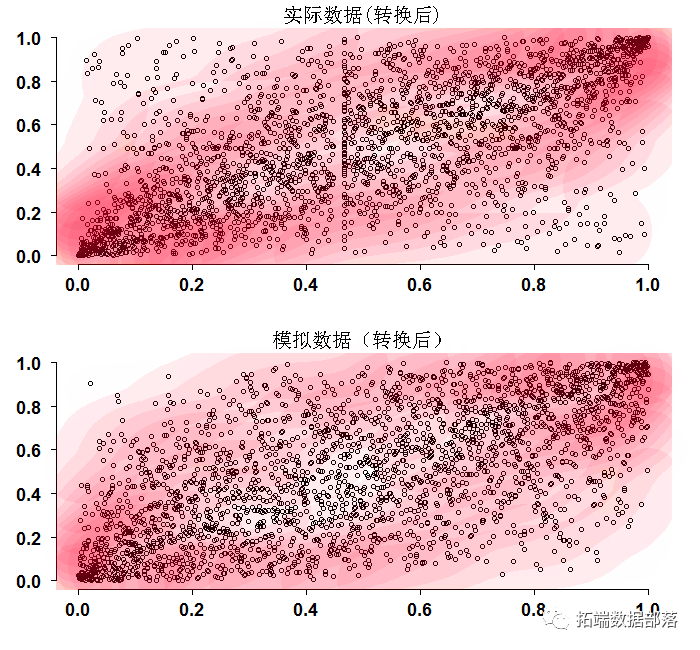 我们现在要做的是按照讨论的方法对数据进行转换(称之为概率积分转换),并将其绘制出来。同时,我们模拟两个具有相同(量化-非条件)相关性的随机常模,并比较这两个数字。