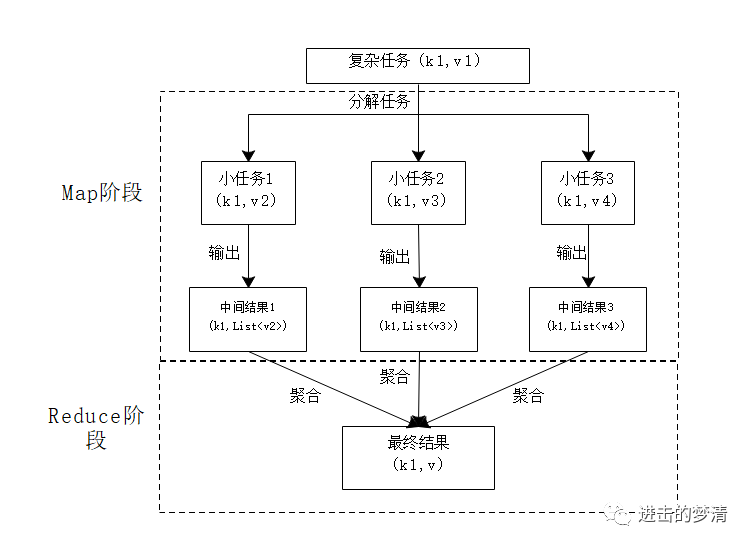 MapReduce 编程模型借鉴了 "分而治之" 的思想,将一个大而复杂的计算问题分解成多个小的计算问题,由多个map()函 数对这些分解后的小问题进行并行计算,输出中间计算结果,然后由 reduce() 函数对 map() 函数的输出结果进行进一步合并,得出最终的计算结果。