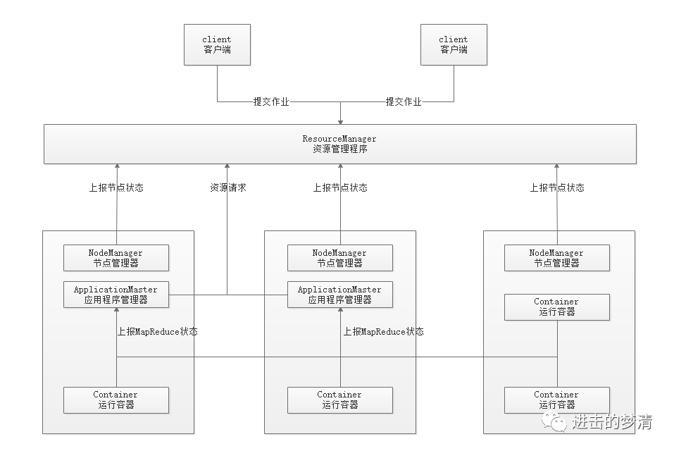 Contain: 为资源申请和任务运行的容器, 会向 Application Master 上报 MapReduce 状态。