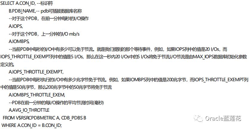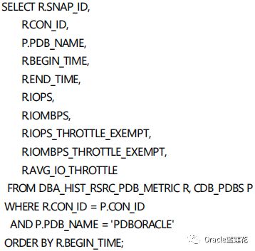 🔘我们可以使用DBA_HIST_RSRC_PDB_METRIC视图计算PDB的合理I/O限制。在计算限制时,建议考虑关键字段信息,如::IOPS, IOMBPS, IOPS_THROTTLE_EXEMPT, 以及IOMBPS_THROTTLE_EXEMPT。