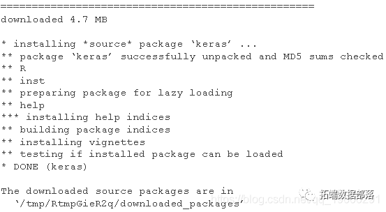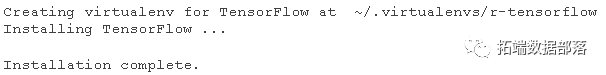 由于keras只是流行的深度学习框架的一个接口,我们必须安装一个特殊的深度学习后端。默认和推荐的后端是TensorFlow。通过调用install_keras(),它将为TensorFlow安装所有需要的依赖项。下面的单元格需要一分钟左右的时间来运行。