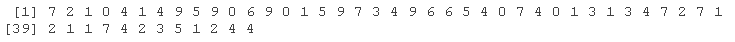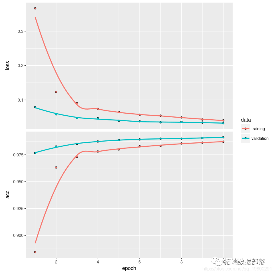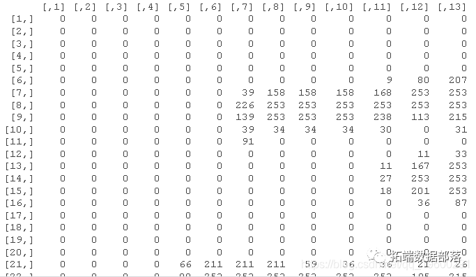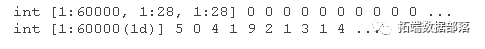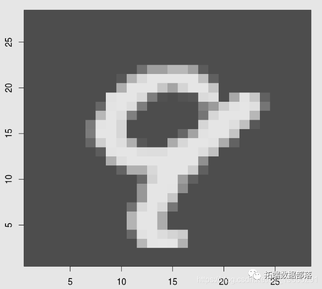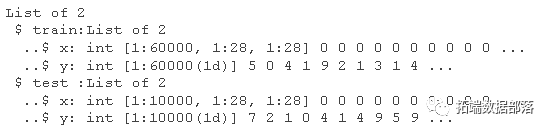 MNIST数据集的数据结构简单明了,有两块。(1) 训练集:x(即特征):60000x28x28张量,对应于60000张28x28像素的图像,采用灰度表示(即每个28x28矩阵中所有的值都是0到255之间的整数),y(即因变量):一个长度为60000的向量,包含相应的数字,整数值在0到9之间。(2) 测试集:与训练集相同,但只有10000个图像和因变量。数据集的详细结构可以通过下面的str(mnist)看到。