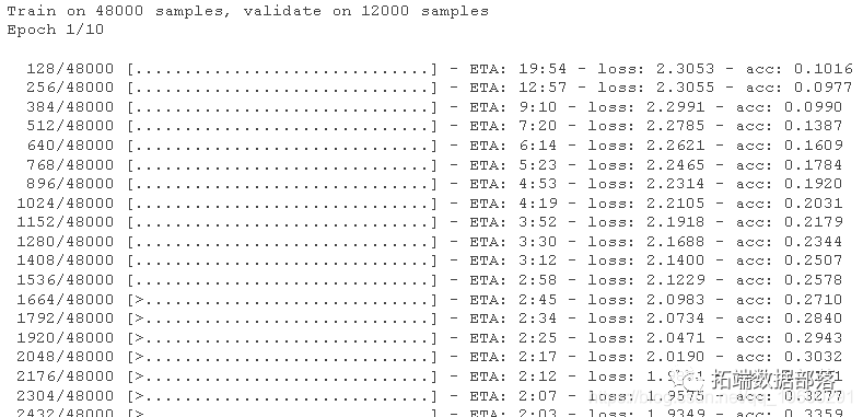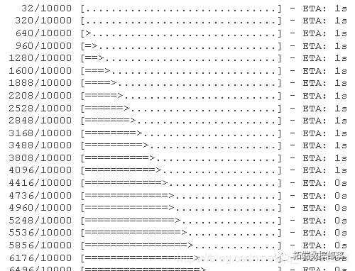 现在,我们可以用处理过的数据来训练模型。每个epochs的历史记录都可以被保存下来以追踪进度。请注意,由于我们没有使用GPU,它需要几分钟的时间来完成。在等待结果时,请耐心等待。如果在GPU上运行,训练时间可以大大减少。