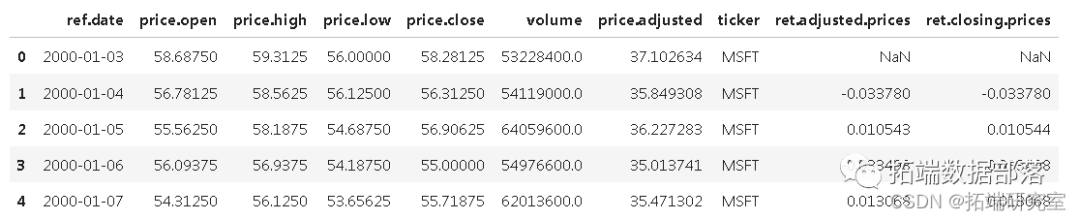 有几种方法可以获取股市数据。以下数据集是使用 R BatchGetSymbols 生成的。