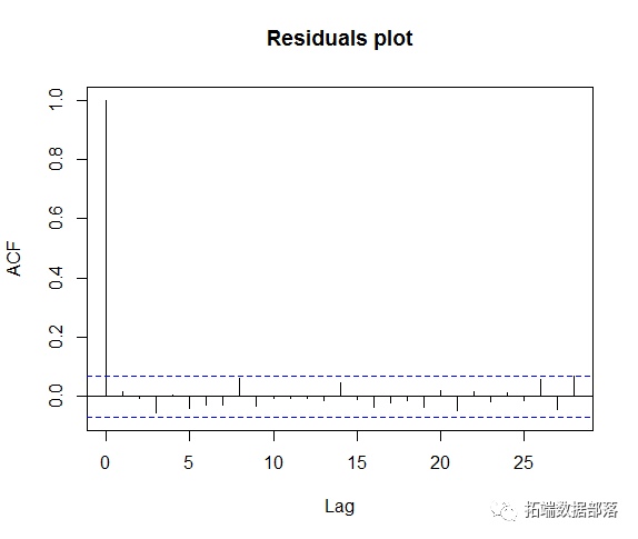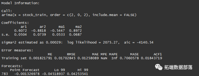 系数给出了标准误差,这需要在可接受的范围内。Akaike信息标准(AIC)评分是ARIMA模型准确性的良好指标。模型更好地降低AIC得分。我们还可以查看残差的ACF图; 良好的ARIMA模型的自相关性将低于阈值限制。预测的点收益为-0.001326978,在输出的最后一行中给出。