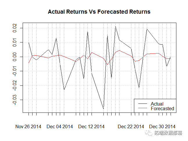我们可以使用摘要功能确认ARIMA模型的结果在可接受的范围内。在最后一部分中,我们将每个预测收益和实际收益分别附加到预测收益序列和实际收益序列。