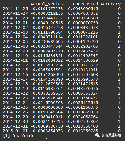 模型的准确率百分比达到55%左右。可以尝试运行模型以获得(p,d,q)的其他可能组合,或者使用auto.arima函数选择最佳的最佳参数来运行模型。