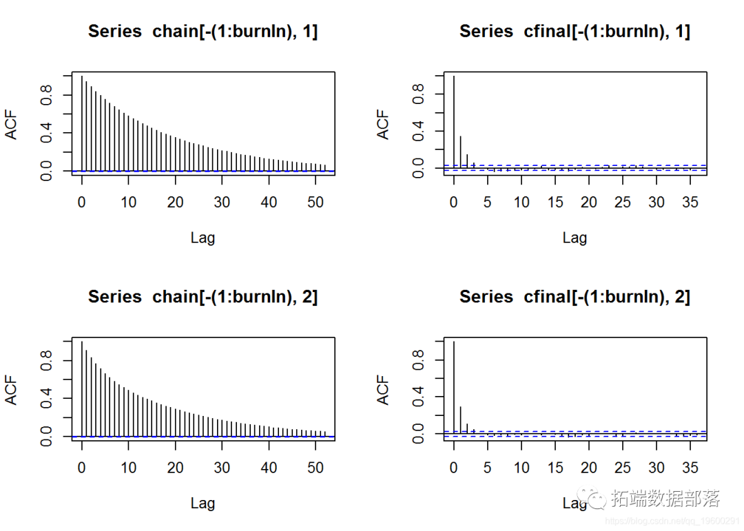 在这里,你可以看到ACF图,它给我们提供了任何序列与其滞后值的自相关值。在这种情况下,我们展示了初始MCMC链的ACF图和对两个参数的样本进行稀释后的最终链。从图中我们可以得出结论,所使用的程序实际上能够大大减少自相关。