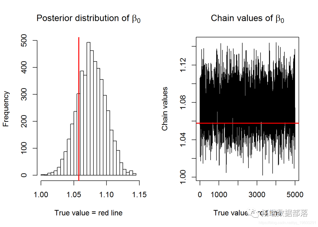在这一节中,我们介绍了由Metropolis采样器产生的链以及它对参数β0和β1的分布。参数的真实值由红线表示。