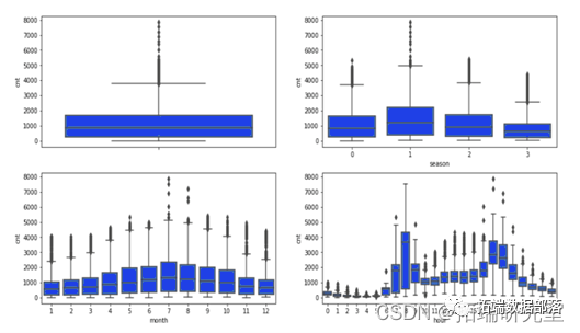 (一)时间:首先从“timestamp”列中提取了“month”和“hour”两列,试图分别从整体、季度、月份、小时四个方面,对共享单车借用总数进行箱图分析。