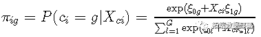 潜在类别成员由离散随机变量 ci 定义,如果主题 i 属于潜在类别 g (g = 1, …,G),则该变量等于 g。变量 ci 是潜在的;根据协变量 Xci 使用多项逻辑模型描述其概率: