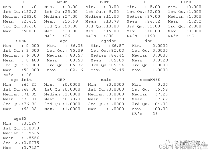这是来自原始前瞻性研究 的 500 名受试者的子样本。该数据集不能用于流行病学目的,因为子样本不代表原始队列(特别是痴呆病例已被过度采样)。