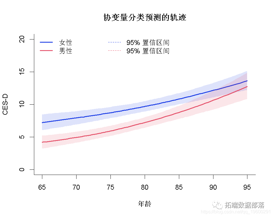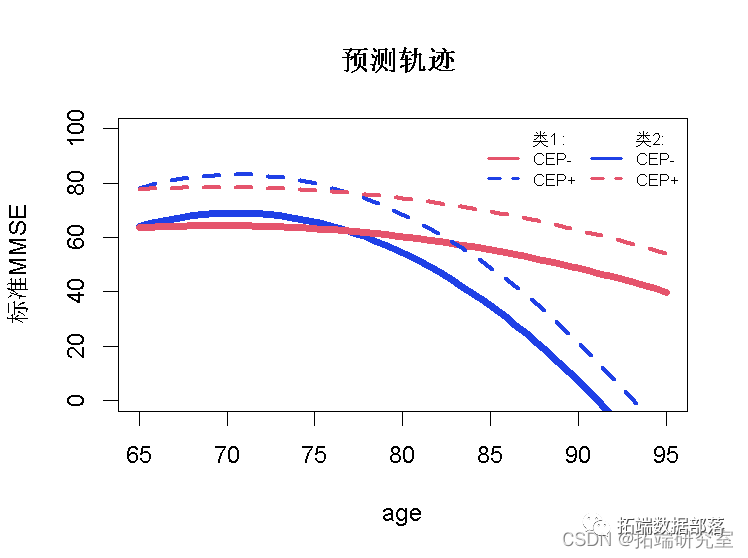 只要模型中指定的所有协变量都包含在数据框中,就可以为数据框中包含的任何数据计算特定于类的预测。在接下来的几行中,通过生成年龄值介于 65 和 95 之间的向量并将 CEP定义为 1 或 0,来创建这样的数据框 。计算和绘制 预测 。