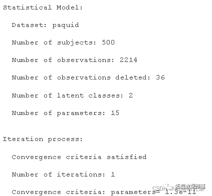 从通过假设单个潜在类估计的模型,我们现在可以搜索异构概况。下一行提供了使用 G>1 时初始值对 2 个潜在类的模型的估计。