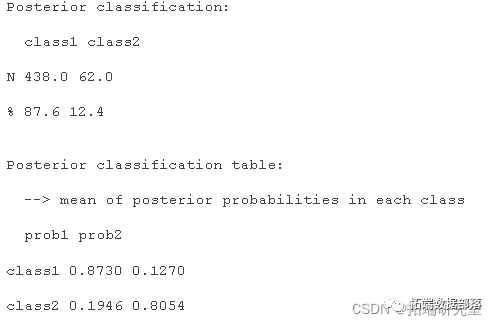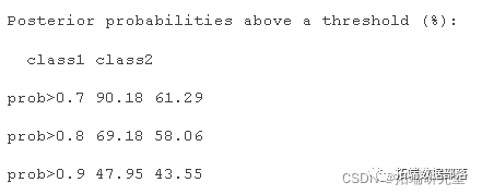 ) 中的对象属于该类的平均概率为 0.8054 (resp. 0.8730)。这显示了类别的良好区分。高于阈值的分类的比例:这里 90.18%(分别为 61.29%)的第 1 类(分别为 2)的后验概率大于 70%。