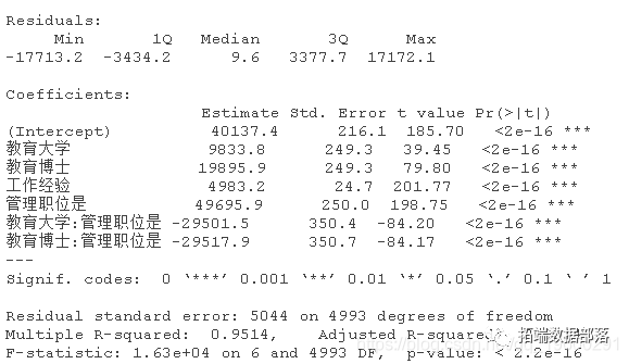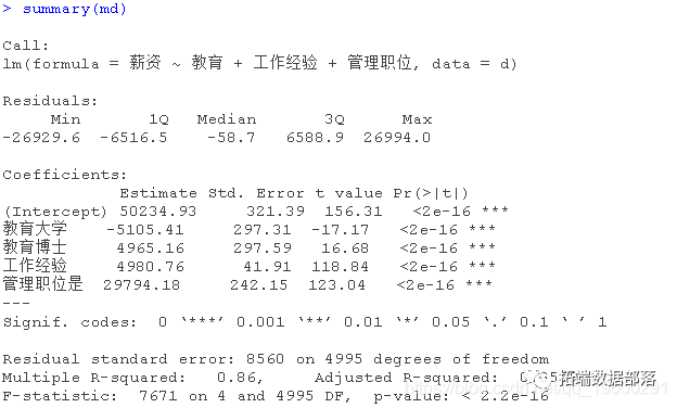 虽然这些参数在统计学上是有意义的,但这并没有任何意义。与高中相比,大学学历怎么可能使你的工资减少5105?