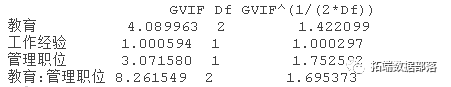 预测变量edu、exp和mngt的VIF值均小于5,因此满足这一假设。