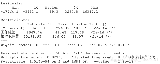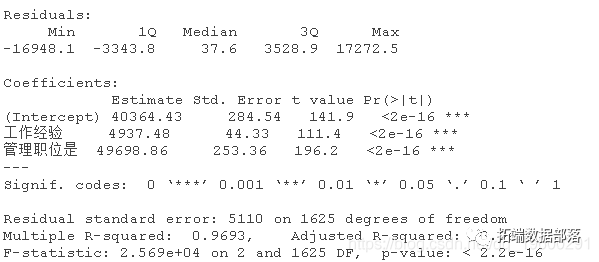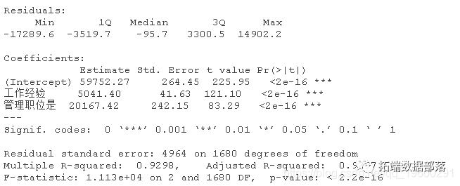 我们只将工资与教育、经验和管理职位进行回归。其结果是