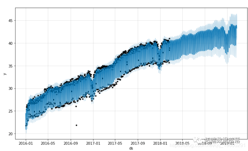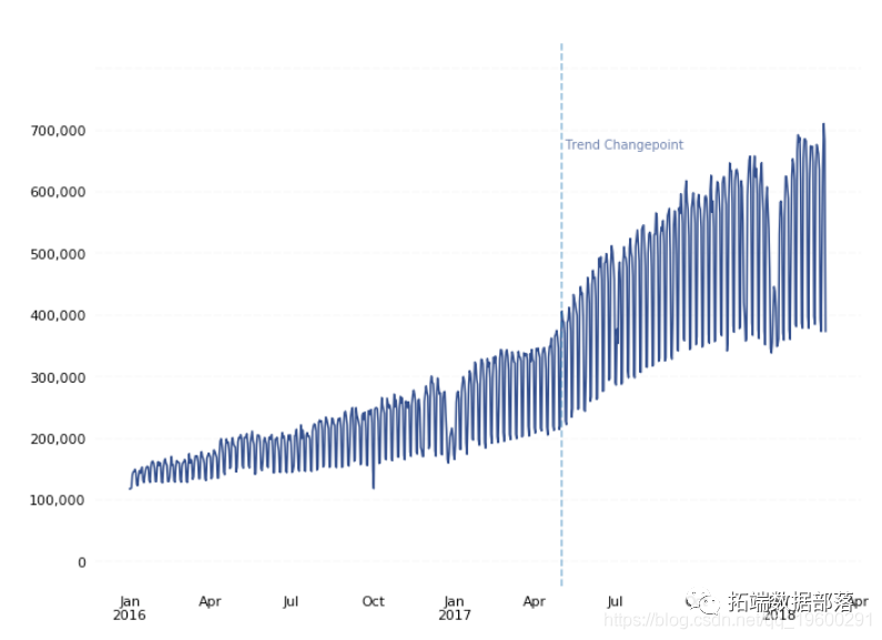 2017年5月左右,趋势轨迹发生了明显变化。默认情况下,Prophet自动检测到此类“ 趋势变化点 ”,并允许趋势进行适当调整。