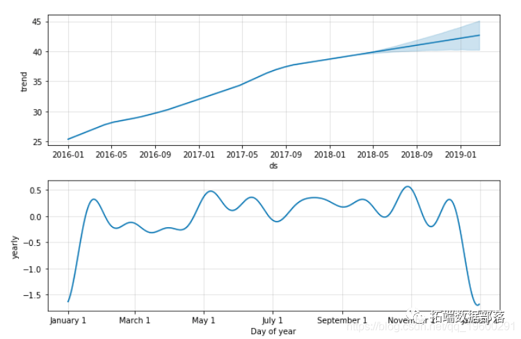 预测和成分可视化显示,Prophet能够准确地建模数据中的潜在趋势,同时还可以精确地建模每周和每年的季节性(例如,周末和节假日的订单量较低)。