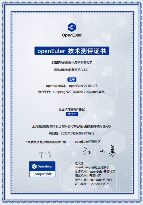 近日,爱数签署 CLA(全称 Contributor License Agreement,中文为“贡献者许可协议”),正式加入openEuler社区,与此同时,爱数AnyBackup与openEuler完成相互兼容性测试,成功通过openEuler技术测评认证。双方强强联合,致力于通过双方优势合作,在护航海量数据安全的同时,释放数据价值,助力数字化业务加速发展。