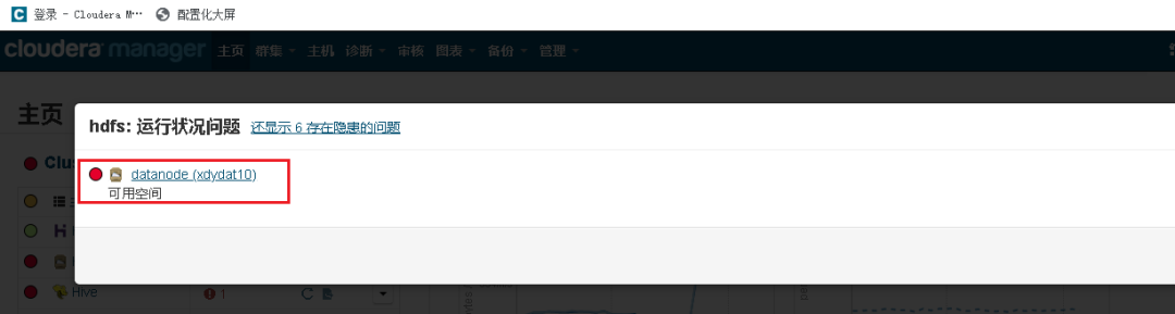 某hadoop集群的某个datanode节点主机有坏盘,但是没有配件及时更换,当几天后更换,启动datanode节点时,CM界面显示对应的XDYDAT10主机可用空间告警。如下图: