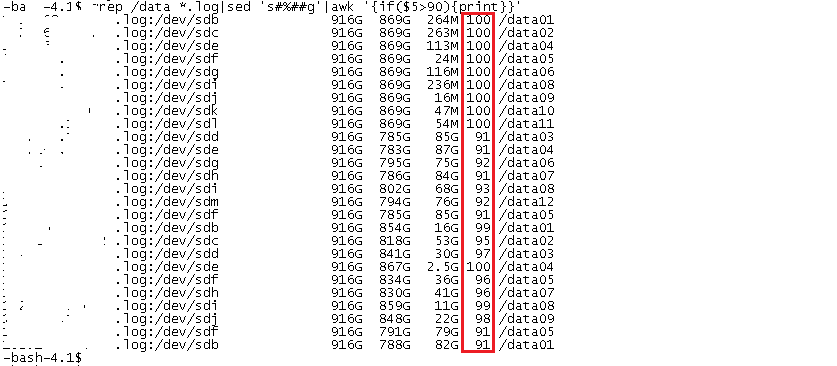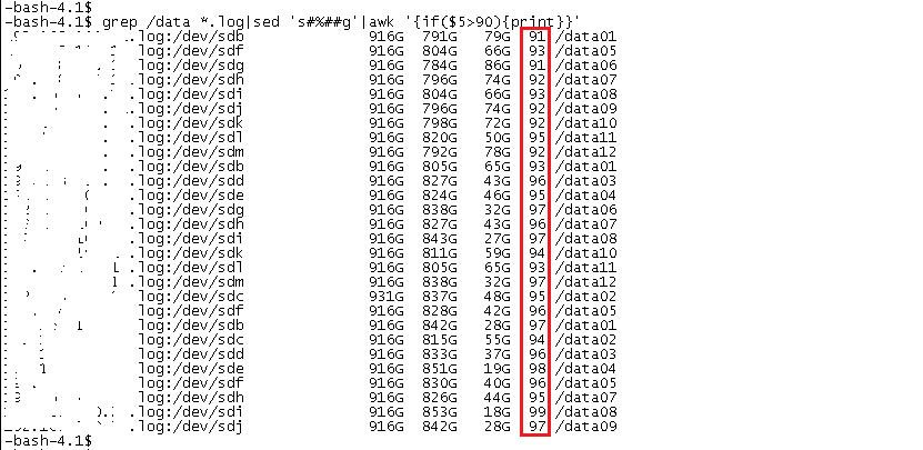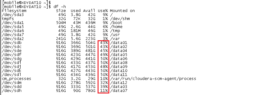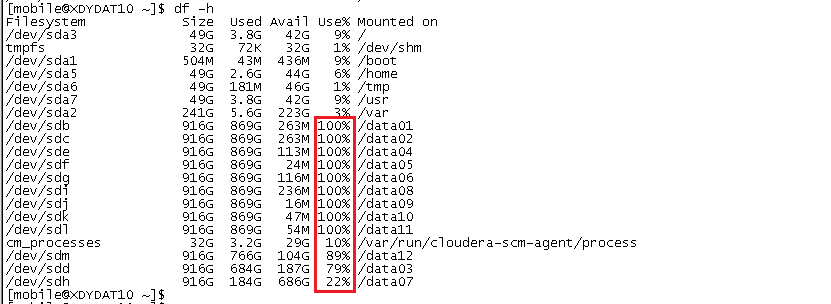 检查该datanode空间使用情况:hdfs使用率86.88%,剩余空间976.62GB,但是主机单个磁盘空间大都100%。如下图: