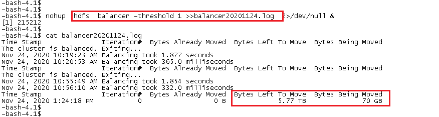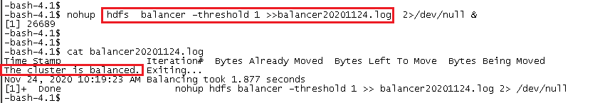 启停磁盘空间不足的datanode节点后,再使用hdfsbalancer -threshold 1运行均衡器进行数据均衡,最终达到集群数据均衡。
