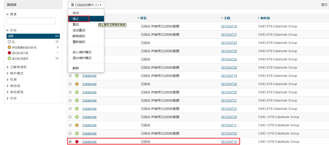 通过CM界面,在HDFS实例界面,选择XDYDAT10,停止其datanode服务。如下图: