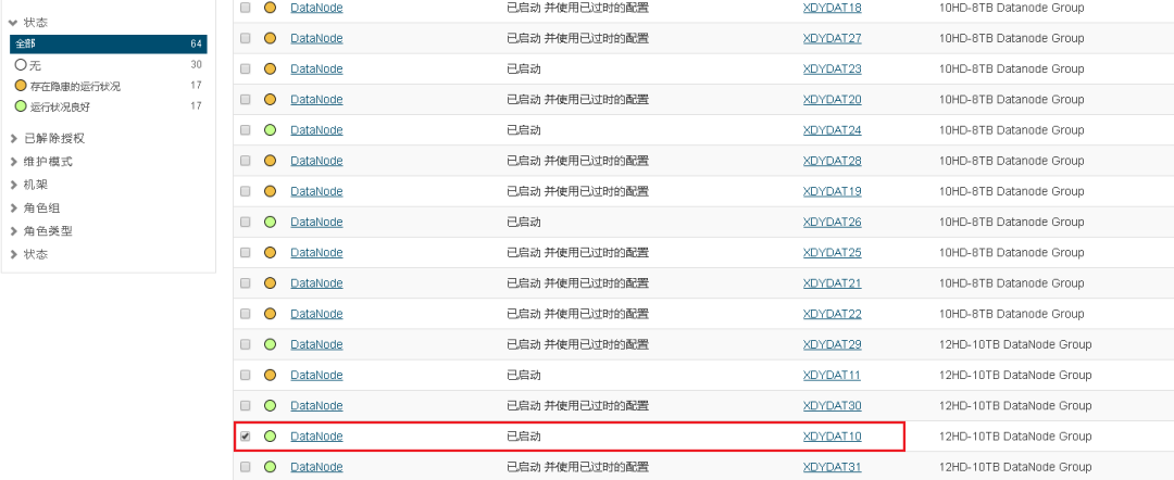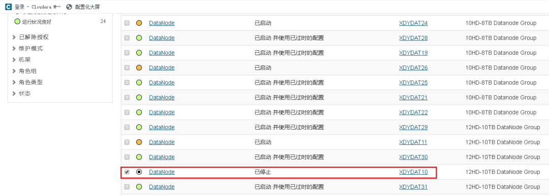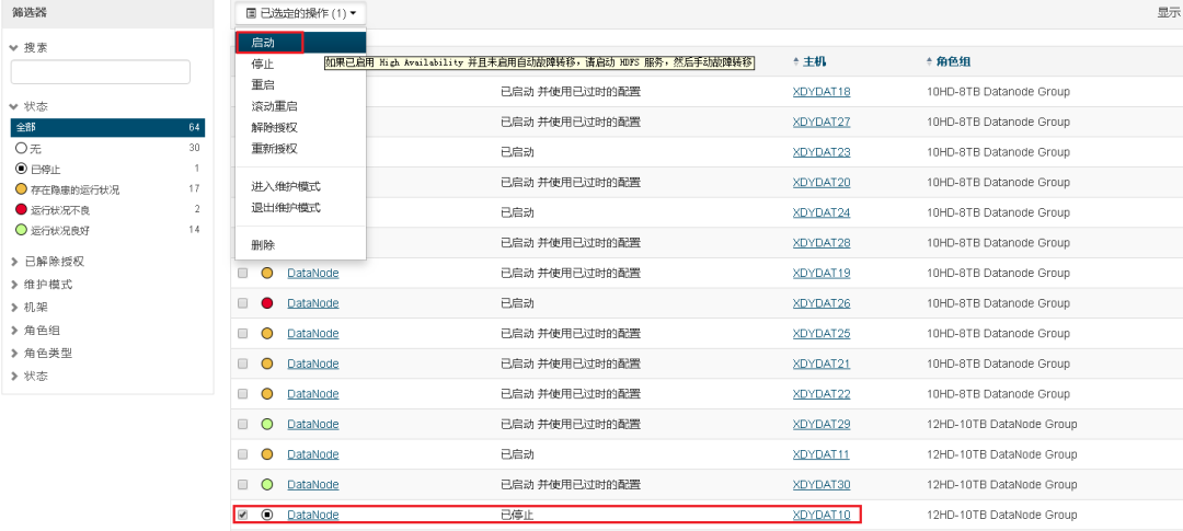 若干小时后(本次操作是3小时左右后),通过CM界面,在HDFS实例界面,选择XDYDAT10,启动其datanode服务。如下图: