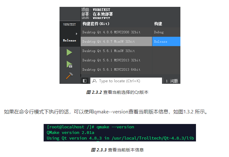 如果使用Qt Creator开发工具的话,可以在该工具界面左下角的套件选择器中查看当前选择的Qt版本,如图1.3.1 所示。