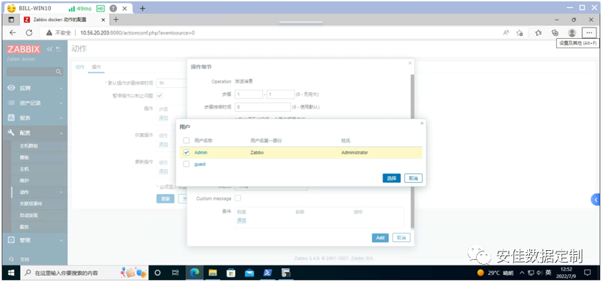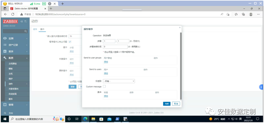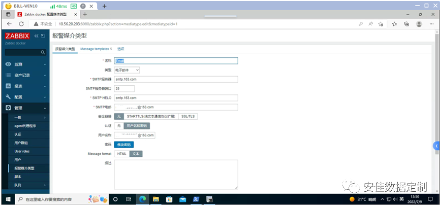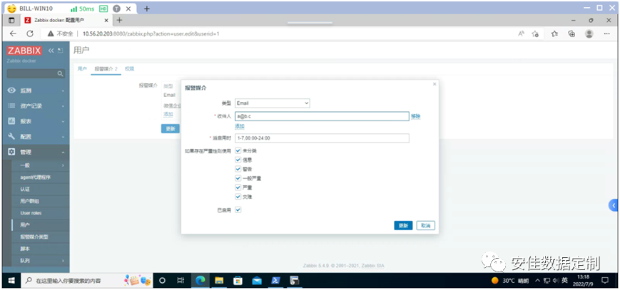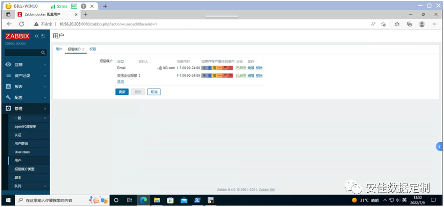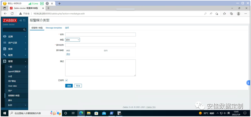 点击《Admin》进行编辑,在切换后的界面里点击《报警媒介》后选择《添加》,