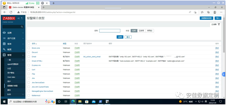 点击主界面左侧《管理》,然后点击《报警媒介类型》,如下图