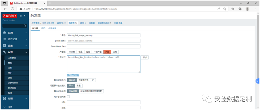 当前测试主机的C盘磁盘剩余为87%,为了模拟测试,修改模版Tem-win-bill中的C盘空间触发器报警阈值为85,然后往C盘拷贝大文件,使磁盘空间剩余率小于85,测试是否告警。