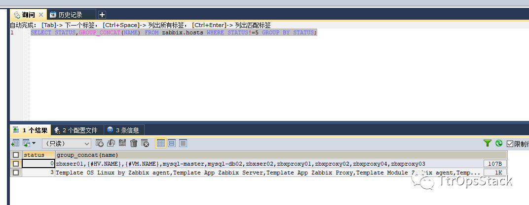 “由结果可以看到,查询结果分为两组,status 字段值为“0”的是一组,值为“3”的是一组,且每组的主机名或者模板名称都显示出来了。