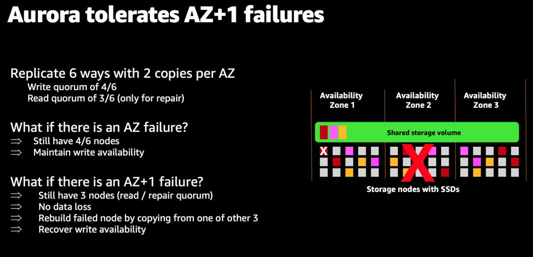 - 在同一个AZ中丢失两个副本,则该AZ的请求用户会感知延迟增大,因为在这个AZ的请求自动转迁移到其它AZ中,但这个数据库依然可以提供写操作。