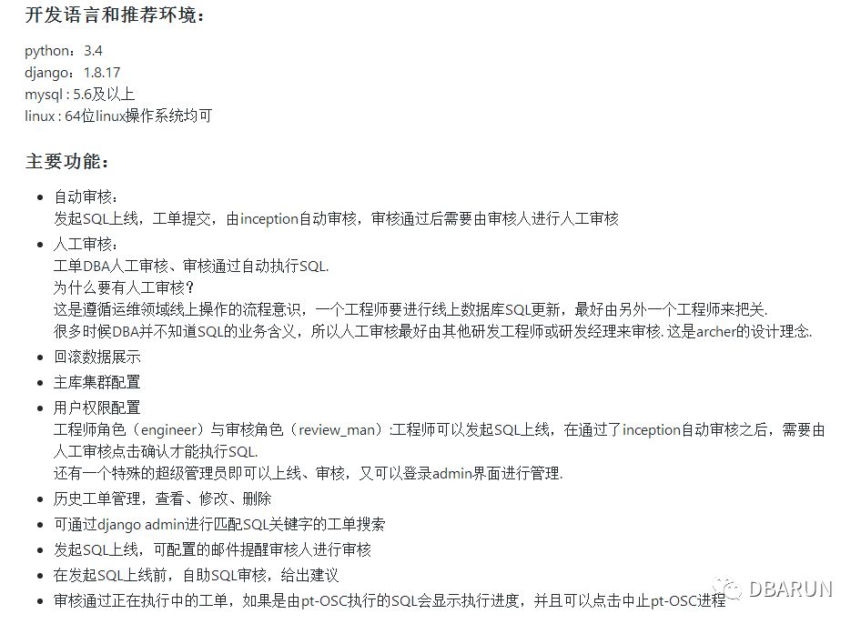 后来也在公司试水自动化运维,尝试用python开发了几个小工具,切身感受到自动化带来的便利,自动化确实能避免很多低价值、重复繁琐的劳动。同时也一直在思考,能否借助自动化来实现SQL审核呢?也算是机缘巧合吧,偶然在githup上发现一个SQL审核的开源项目archer,折腾试用一番后,两年前的那种狂热又冒出来了……
