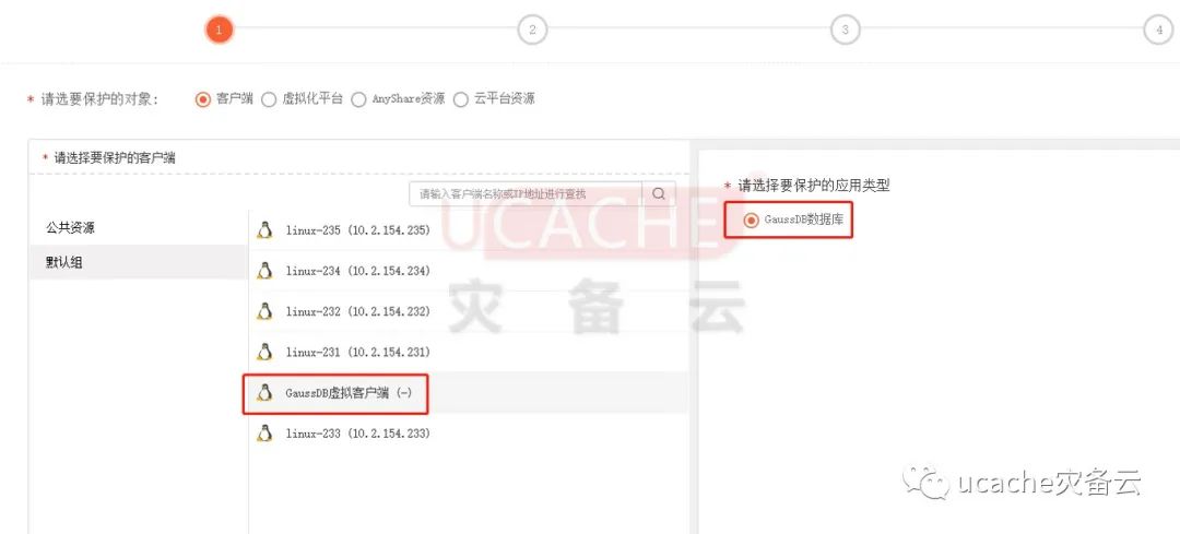 点击【新建】,选择要保护的对象,→默认选【客户端】 选择要备份的客户端,多个可以指定进行勾选,选择要保护的应用类型: →【GaussDB数据库】,点击【下一步】。