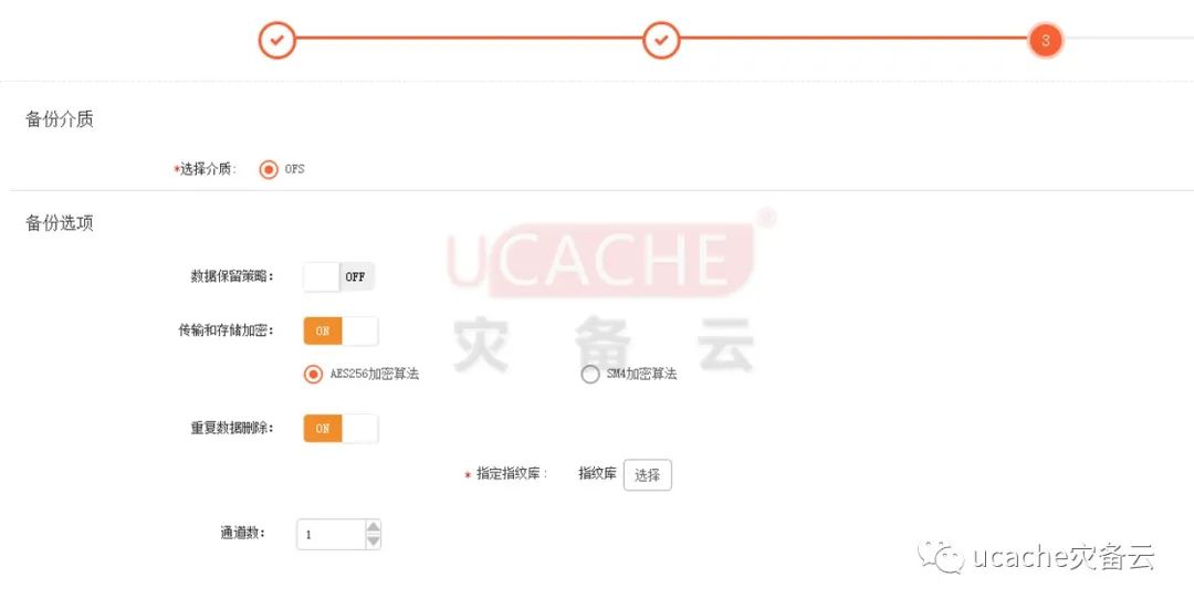1、点击【下一步】,进入备份选项配置界面,可以配置【数据保留策略】、【传输和存储加密】、【重复数据删除选项】、【通道数】。