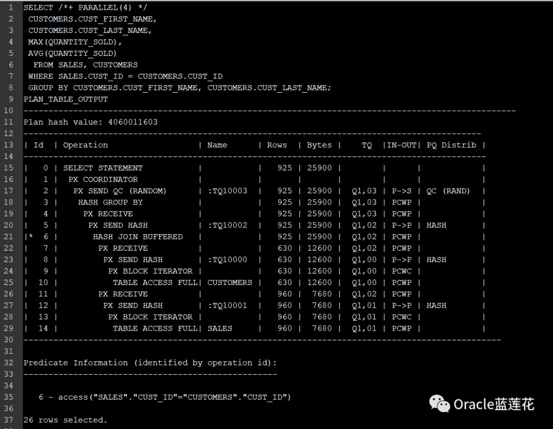 整体执行逻辑为:table access full sales或者table access full customers ->hash join ->group by sort ->parallel execution coordinator