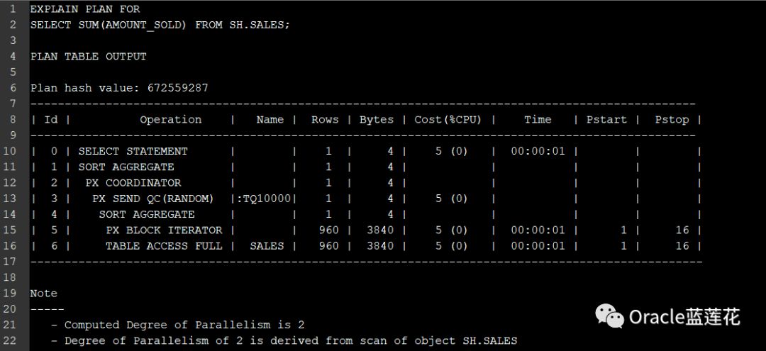 优化器确定的DOP显示在执行计划输出的notes部分(如下面的解释计划输出所示),使用执行计划语句或V$SQL_PLAN都可以看到:
