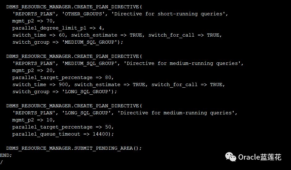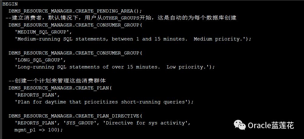 资源计划和使用者组使用DBMS_RESOURCE_MANAGER PL/SQL包创建。资源计划由每个使用者组的一组指令组成,这些指令指定各种数据库资源(如并行服务器)的控制和分配。