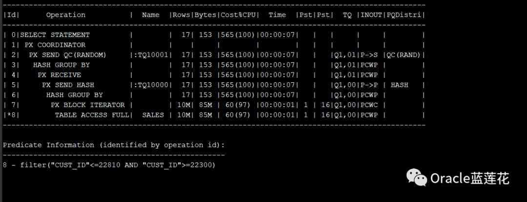 通过查看语句的执行计划,可以知道使用了哪些类型的颗粒。表上方的行PX块迭代器或索引访问表明使用了块范围颗粒。在下面的示例中,可以在explain plan输出的第7行看到这一点,