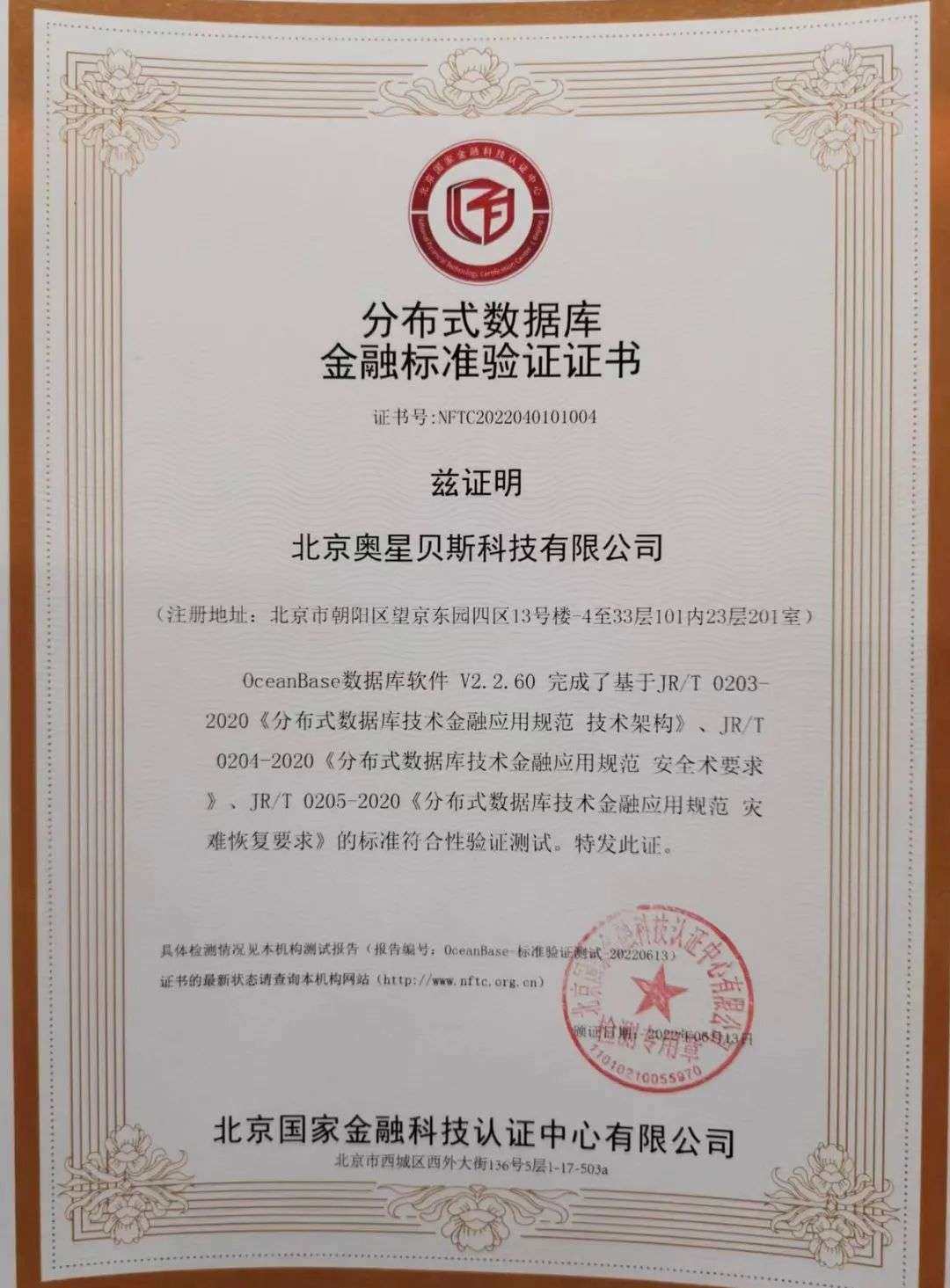 近日,经北京国家金融科技认证中心的严格测试评定,北京奥星贝斯科技有限公司OceanBase 数据库产品完成了“分布式数据库金融标准符合性验证”全部测试项目,并获得高分,证明了 OceanBase 数据库满足“分布式数据库金融规范”要求。